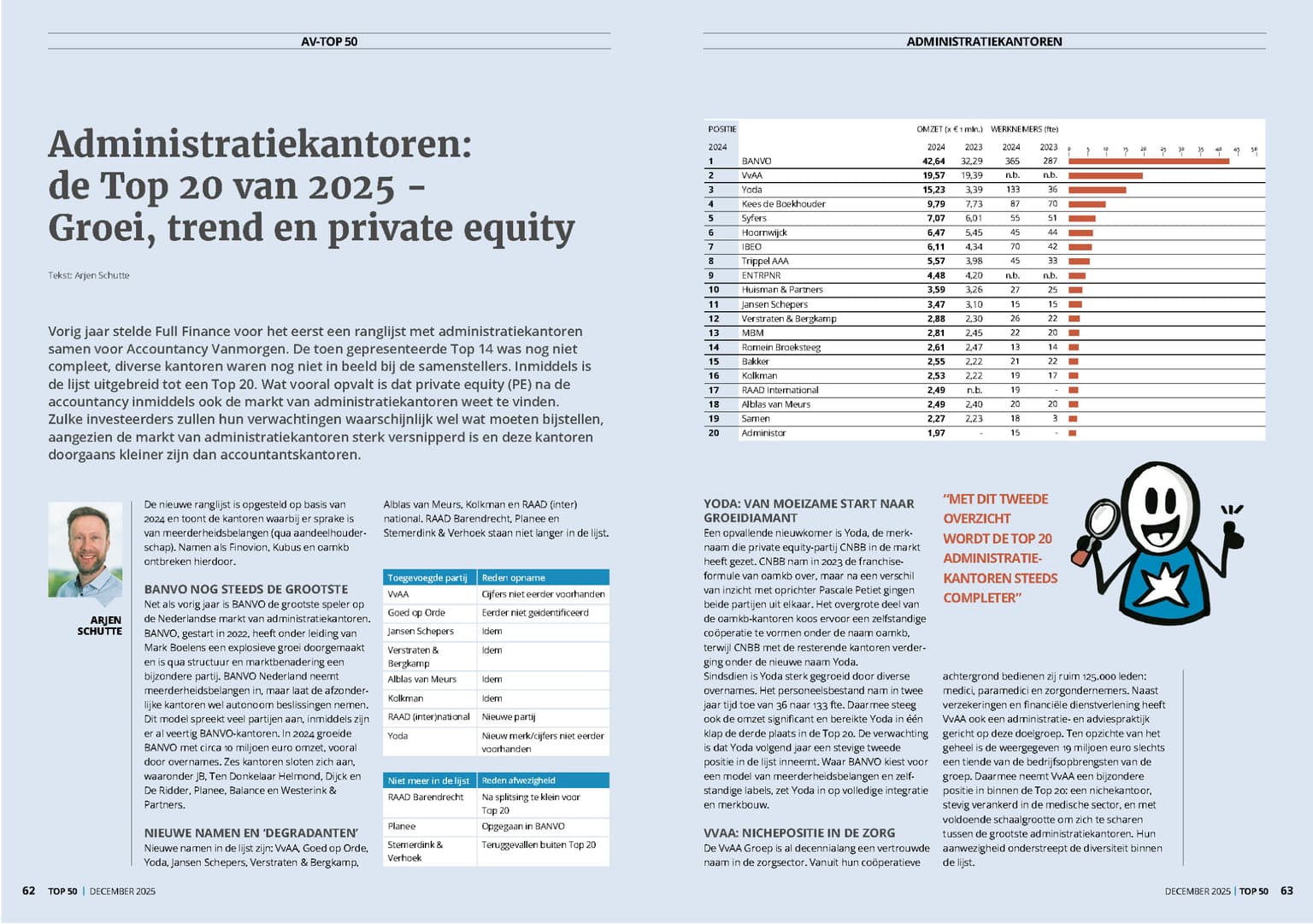 De AV Top 50 Accountancy, samengesteld door Accountancy Vanmorgen en Full Finance Consultants, is al jarenlang dé toonaangevende ranglijst waarin de grootste accountantskantoren van Nederland worden gerangschikt op basis van omzet. De lijst wordt breed gevolgd binnen de financiële dienstverlening en geldt als belangrijke graadmeter voor marktontwikkeling, schaalvergroting en consolidatie in de sector. Sinds 2024 is er een aparte ranglijst voor administratiekantoren: de Top 14, die dit jaar is uitgebreid naar een Top 20. Deze ranglijst is dit jaar voor het eerst opgenomen in dezelfde editie als de Top 50 Accountantskantoren, hetgeen volgens kenners duidt op een zichtbare professionalisering binnen de administratiesector en erkenning van de rol die deze kantoren vervullen.